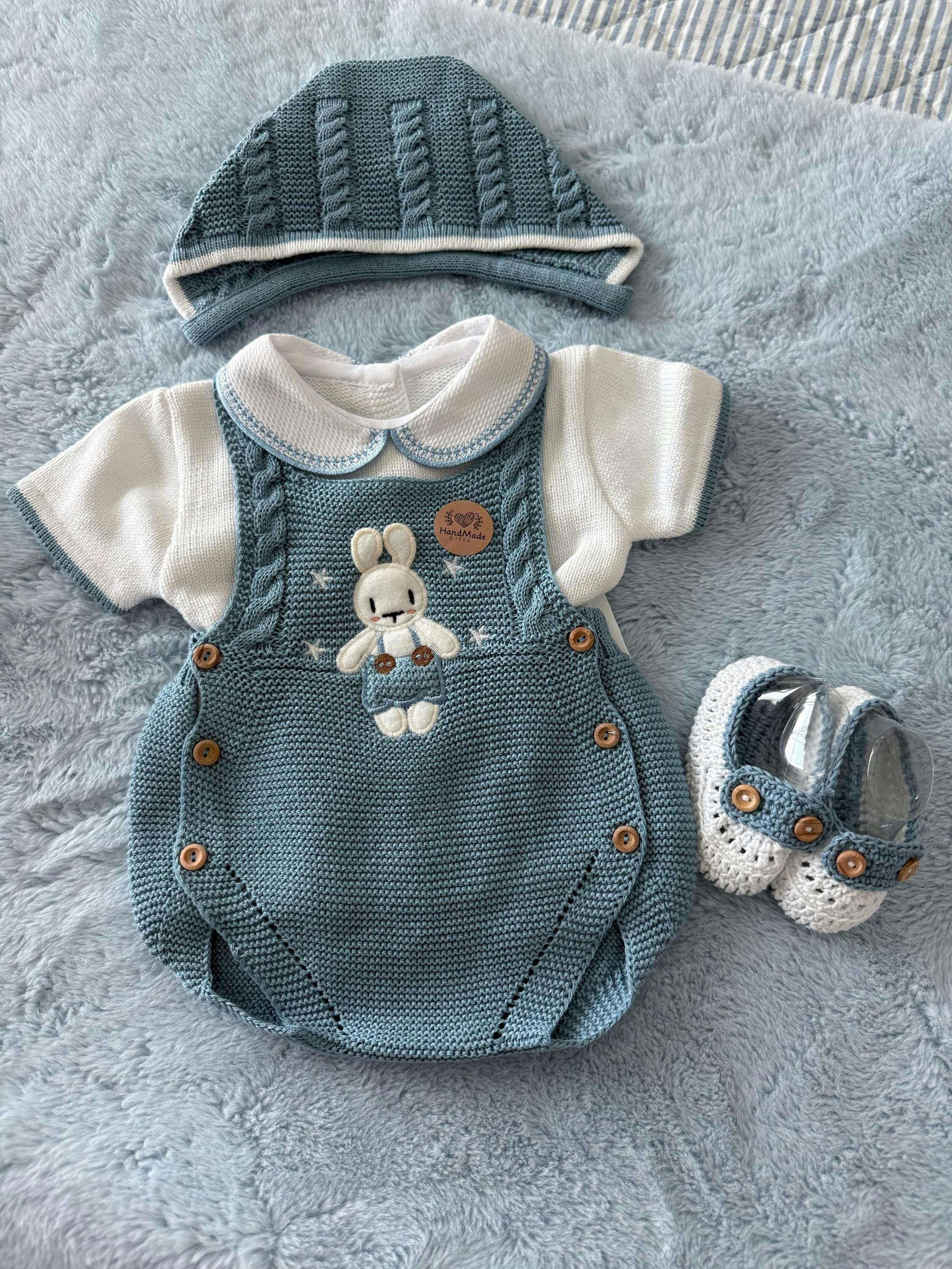Three pieces knitted outfit is crafted, cute little bunny, handmade in Spain. Bootie is included. Perfect Coming home outfit for introducing your baby to the world.